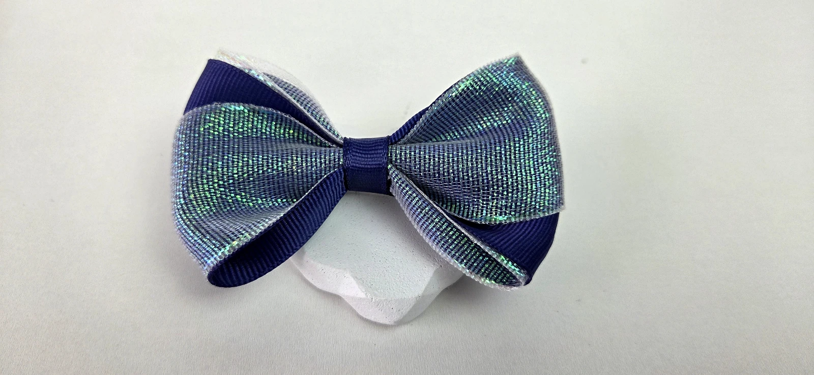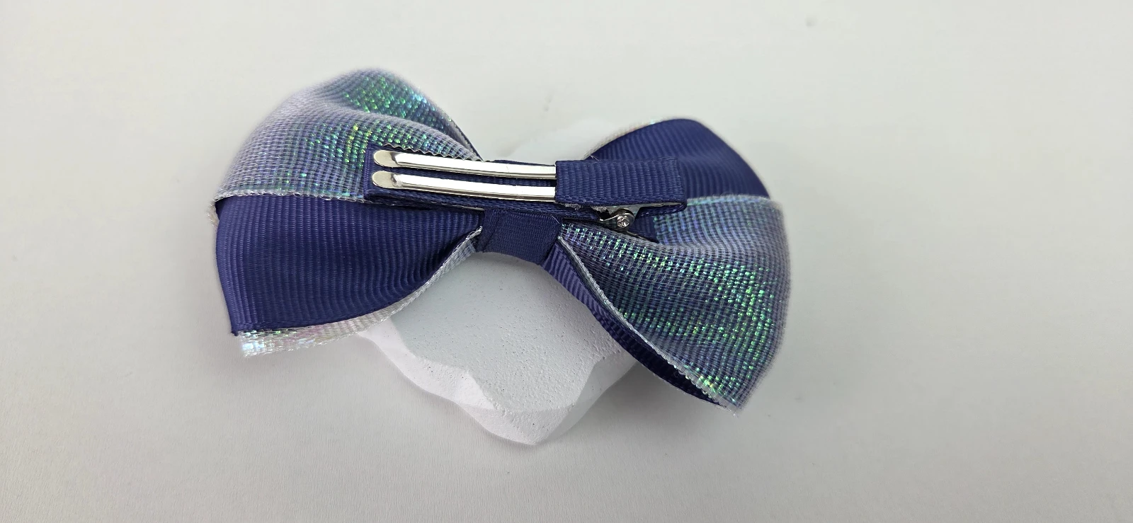 Presilha de cabelo com laço azul marinho com acabamento holográfico, combinando elegância e diversão. Feita com fita de alta qualidade, acabamento reforçado e presilha de metal durável para fixação segura e confortável.