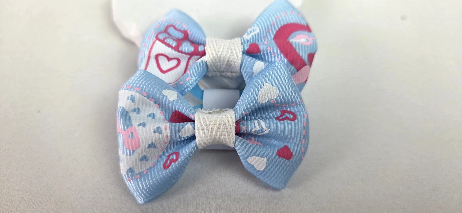 Laço infantil duplo em fita azul claro com delicados corações rosa e branco. Confeccionado em material de alta qualidade, com acabamento reforçado para uso diário e manutenção da forma. Acompanha elástico para prender o cabelo com conforto, sem irritar a pele. Perfeito para escola, festas e looks do dia a dia, combinando com peças claras e candy color.