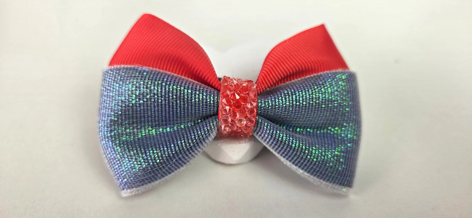 Laço de cabelo em fita dupla com glitter holográfico, combinando vermelho vivo na frente e azul esmeralda nas abas para um visual marcante. O centro transparente com textura traz brilho suave e delicadeza. Prende com elástico, oferecendo fixação estável para festas, escola ou fotos em família. Leve, resistente e fácil de combinar com qualquer look infantil.