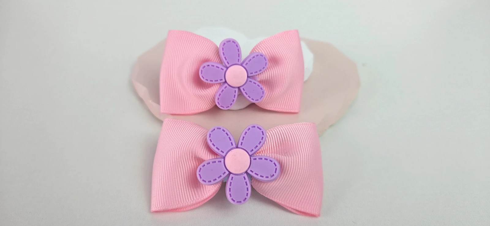 Conjunto com 2 laços de cabelo em fita rosa, cada um com uma flor lilás no centro. Design fofo, acabamento suave e costuras reforçadas para durar. Perfeito para prender o cabelo de meninas em festas, escola ou passeio, deixando o visual delicado e moderno. Leve, confortável e fácil de usar, segura firme sem puxar as mechas.