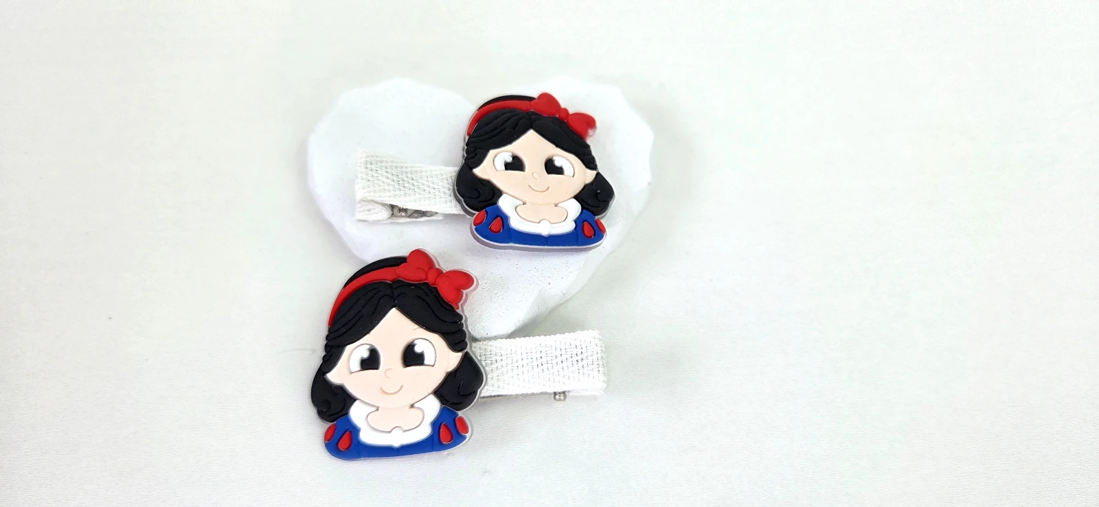 Conjunto com 2 presilhas de cabelo com enfeite da branca de neve. Feita em material resistente com acabamento em resina de alta qualidade, cada peça prende com firmeza e conforto, sem irritar a pele. Ideal para o dia a dia, escola, festas e passeios, deixando o visual das pequenas ainda mais fofo.