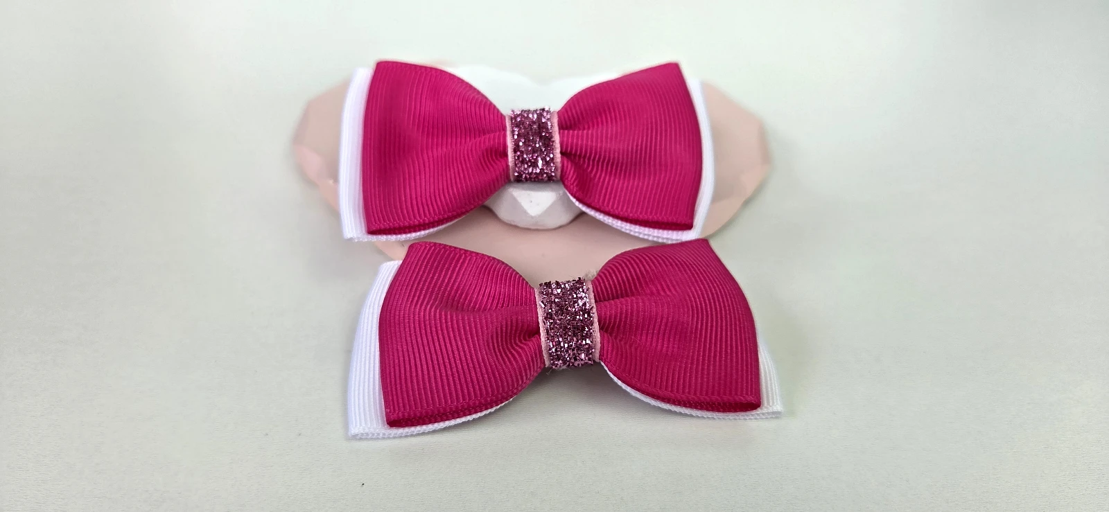 Par de laços de cabelo na cor pink vibrante, com fita de grosgrain resistente e acabamento branco nas bordas. O centro é enfeitado com faixa de glitter rosa, criando um visual fofo e brilhante. Fixação firme e confortável para o uso diário, sem irritar a pele. Ideal para escola, festas ou passeios, combina com qualquer look infantil e valoriza o sorriso da criançada. Duráveis e fáceis de combinar.