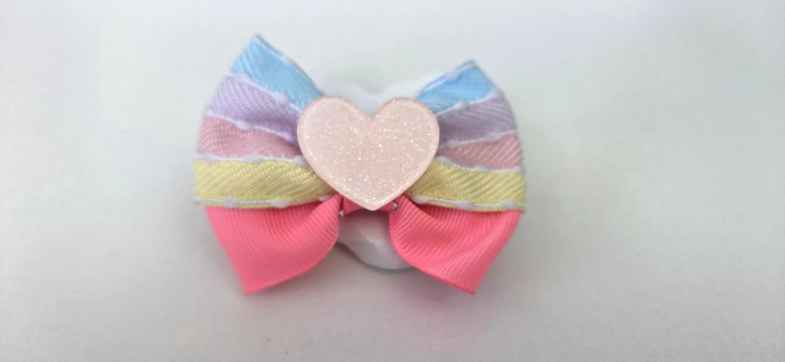 Laço de cabelo feito com fita de alta qualidade em tons pastel com listras delicadas e um centro em formato de coração rosa com glitter. Costuras reforçadas mantêm o laço firme no lugar o dia inteiro, sem desconforto. Perfeito para meninas que adoram looks fofos e coloridos, ideal para o dia a dia, festas e lembrancinhas. Combine com roupas neutras ou coloridas para um toque alegre e romântico.