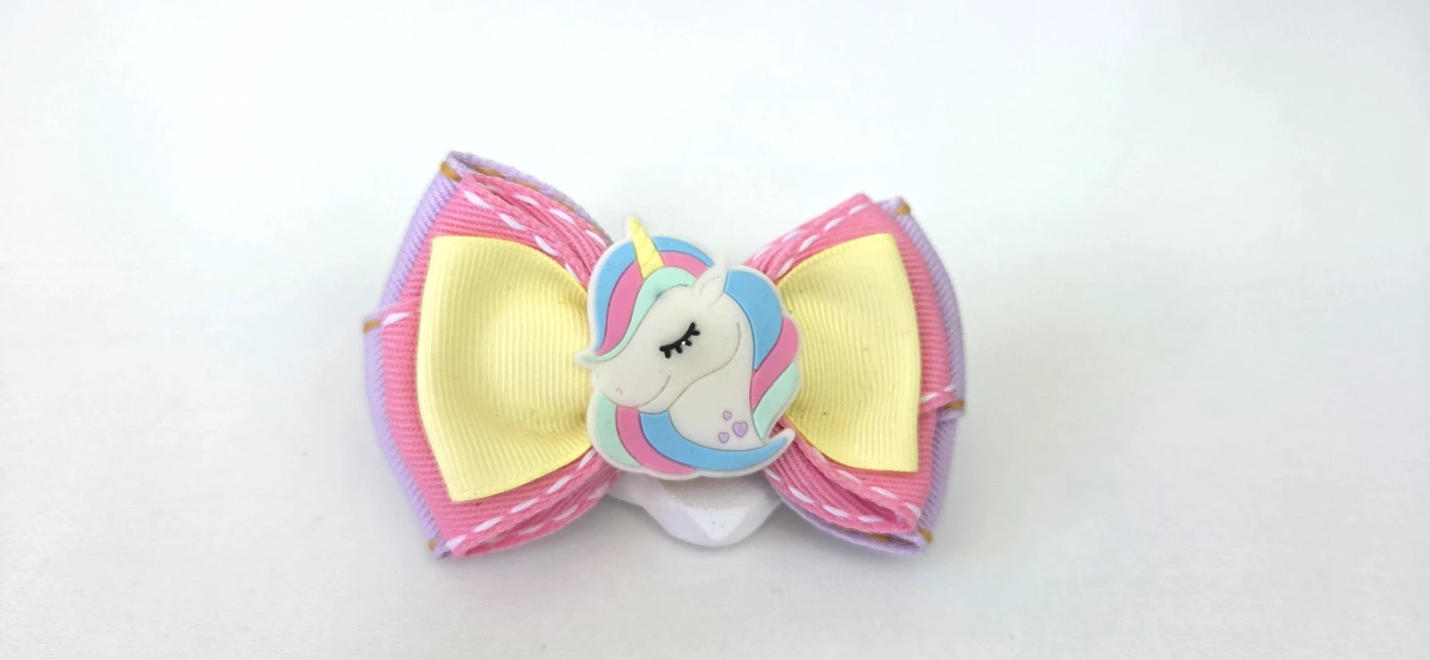 Laço de cabelo confeccionado com fitas de alta qualidade em rosa, lilás e amarelo, com aplique fofo de unicórnio no centro. Costuras reforçadas garantem fixação firme o dia inteiro sem irritar a pele. Leve, macio e divertido, é perfeito para festas, passeios ou uso no dia a dia. Ideal para combinar com looks candy e presentear alguém especial.