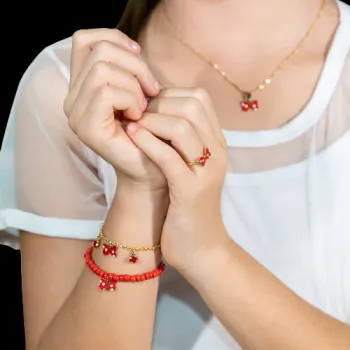Um charme delicado para os dedinhos das pequenas! Com lacinho resinado em rosa ou vermelho com bolinhas brancas, esse anel é pura fofura e estilo.